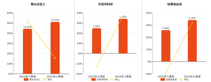 公司营业总收入为18.24亿元。归母净利润为1.45亿元。经营活动现金净流入为6.18亿元。