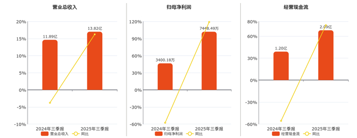 公司营业总收入为13.82亿元,在已披露的同业公司中排名第29。归母净利润为7448.49万元,在已披露的同业公司中排名第30。经营活动现金净流入为2.09亿元。
