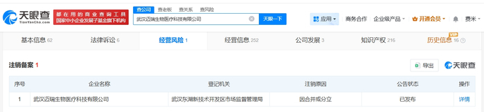 雷达财经讯,天眼查经营风险信息显示,近日,武汉迈瑞生物医疗科技有限公司新增一则注销备案公告,注销原因为因合并或分立。