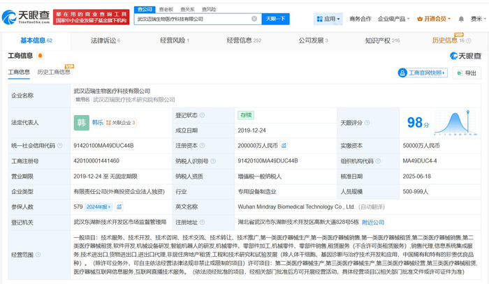 该公司成立于2019年12月,法定代表人为韩乐,注册资本20亿人民币,经营范围包括第一类医疗器械生产、第二类医疗器械销售、智能机器人的研发等,由迈瑞医疗(300760)全资持股。
