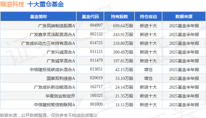 持有锦浪科技最多的基金为广发高端制造股票A,目前规模为44.64亿元,最新净值1.4317(10月14日),较上一交易日下跌0.47%,近一年下跌2.3%。该基金现任基金经理为郑澄然。