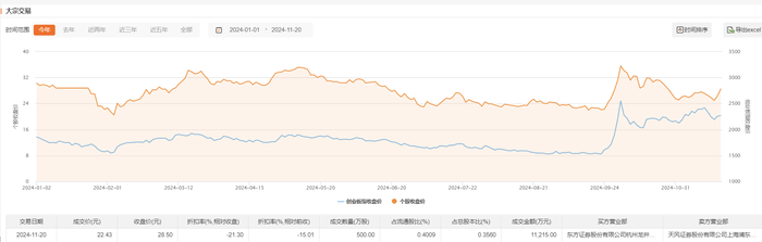 今日大宗交易成交500万股,成交额1.12亿元,占当日总成交额的15.92%,成交价22.43元,较市场收盘价折价21.3%。