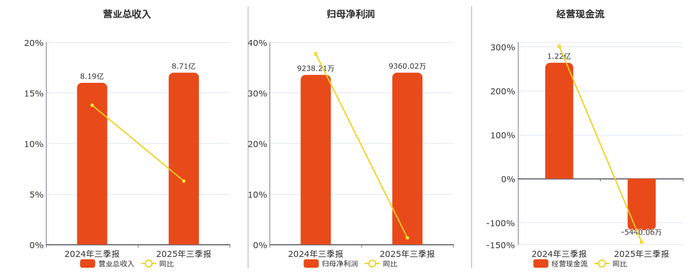 公司营业总收入为8.71亿元。归母净利润为9360.02万元。经营活动现金净流入为-5440.06万元,较去年同报告期经营活动现金净流入减少1.76亿元,同比较去年同期下降144.63%。