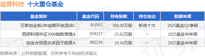 持有迪普科技最多的基金为万家创业板2年定期开放混合C,目前规模为1.14亿元,最新净值0.7611(10月24日),较上一交易日上涨1.44%,近一年上涨19.91%。该基金现任基金经理为黄兴亮。