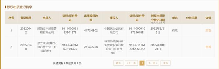 支付之家网获悉,国家企业信用信息公示系统显示,蚂蚁科技集团股份有限公司新增一则股权出质信息。出质人为嘉兴廪瑞股权投资合伙企业(有限合伙),质权人为杭州临普数科企业管理服务合伙企业(有限合伙),出质股权数额为2554.2788万股,登记编号为20250148,出质设立登记日期为2025年10月21日。
