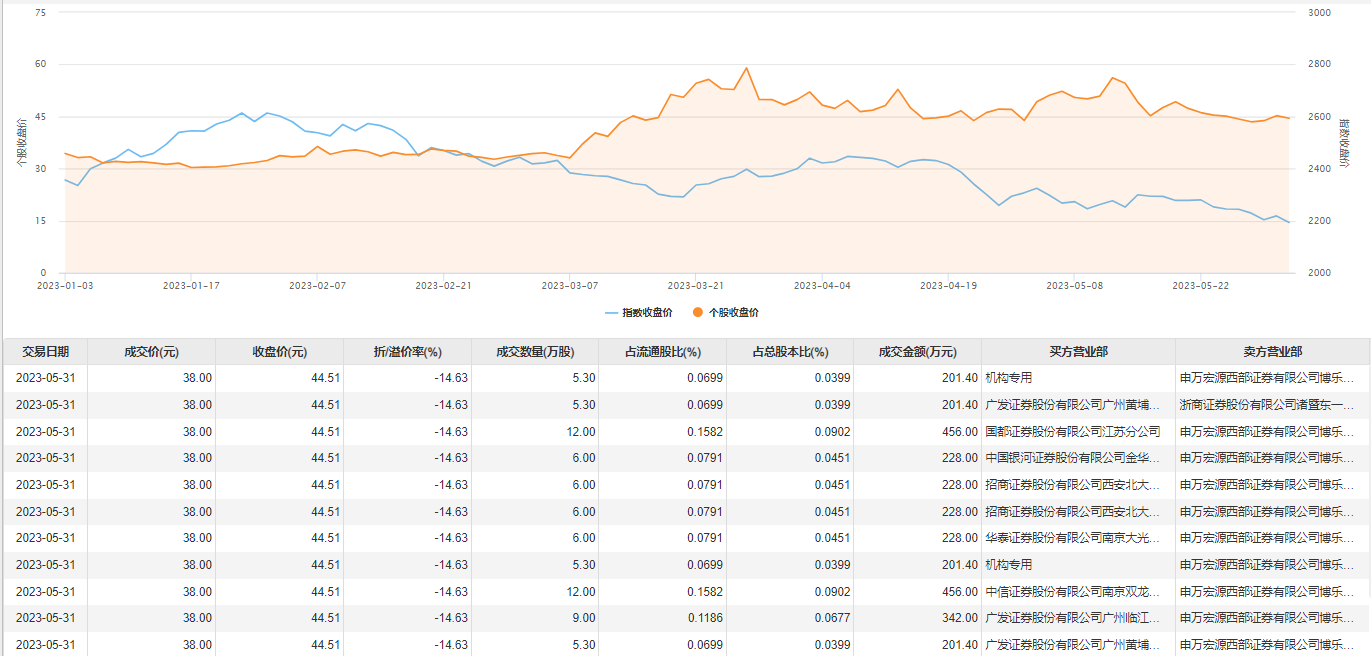 5月31日大宗交易成交78.2万股,成交额2971.6万元,占当日总成交额的12.63%,成交价38元,较市场收盘价44.51元折价14.63%。