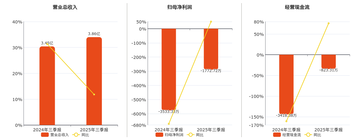 公司营业总收入为3.86亿元,在已披露的同业公司中排名第16。归母净利润为-1772.72万元,在已披露的同业公司中排名第21。经营活动现金净流入为-823.31万元。