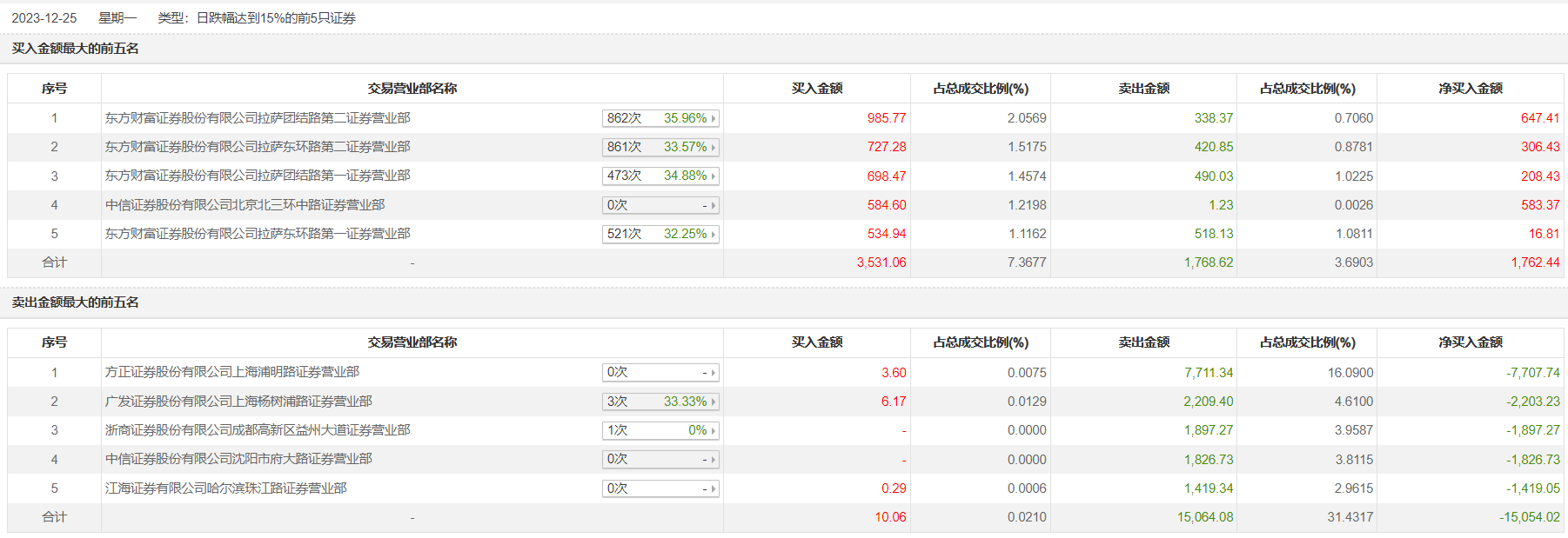 *ST左江12月25日跌17.72%,全天换手率达24.01%,振幅达16.25%。龙虎榜数据显示,营业部席位合计净卖出1.33亿元。其中,方正证券上海浦明路证券营业部、广发证券上海杨树浦路证券营业部分别卖出7711.34万元、2209.40万元;东方财富证券拉萨团结路第二证券营业部、东方财富证券拉萨东环路第二证券营业部分别买入985.77万元、727.28万元。