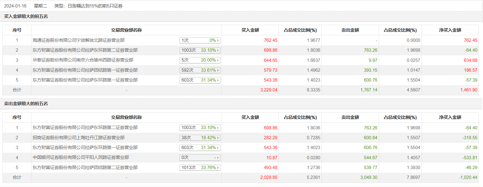 *ST左江1月16日涨停,全天换手率达19.26%,振幅达19.19%。龙虎榜数据显示,营业部席位合计净买入563.25万元。其中,海通证券宁波解放北路证券营业部、东方财富证券拉萨东环路第二证券营业部分别买入762.45万元、698.86万元;东方财富证券拉萨东环路第二证券营业部、招商证券上海牡丹江路证券营业部分别卖出763.26万元、600.84万元。