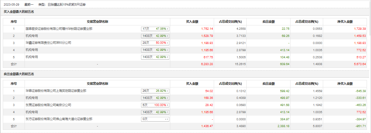 具体来看,机构买入3500.57万元,卖出1085.86万元,合计净买入2414.72万元。此外,国泰君安证券福州华林路证券营业部、华鑫证券深圳分公司分别买入1752.14万元、1198.93万元;华泰证券上海武定路证券营业部、东莞证券南京分公司分别卖出599.42万元、491.68万元。