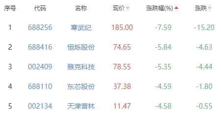 寒武纪、恒烁股份、雅克科技、东芯股份、天津普林位列涨幅榜后五位,涨幅分别为-7.59%、-5.84%、-5.35%、-4.59%、-4.58%。