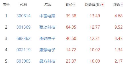 其中,中富电路、联动科技、甬矽电子、康强电子、晶方科技位列板块涨幅前五位,涨幅分别为13.49%、12.77%、12.31%、10.02%、10.00%。