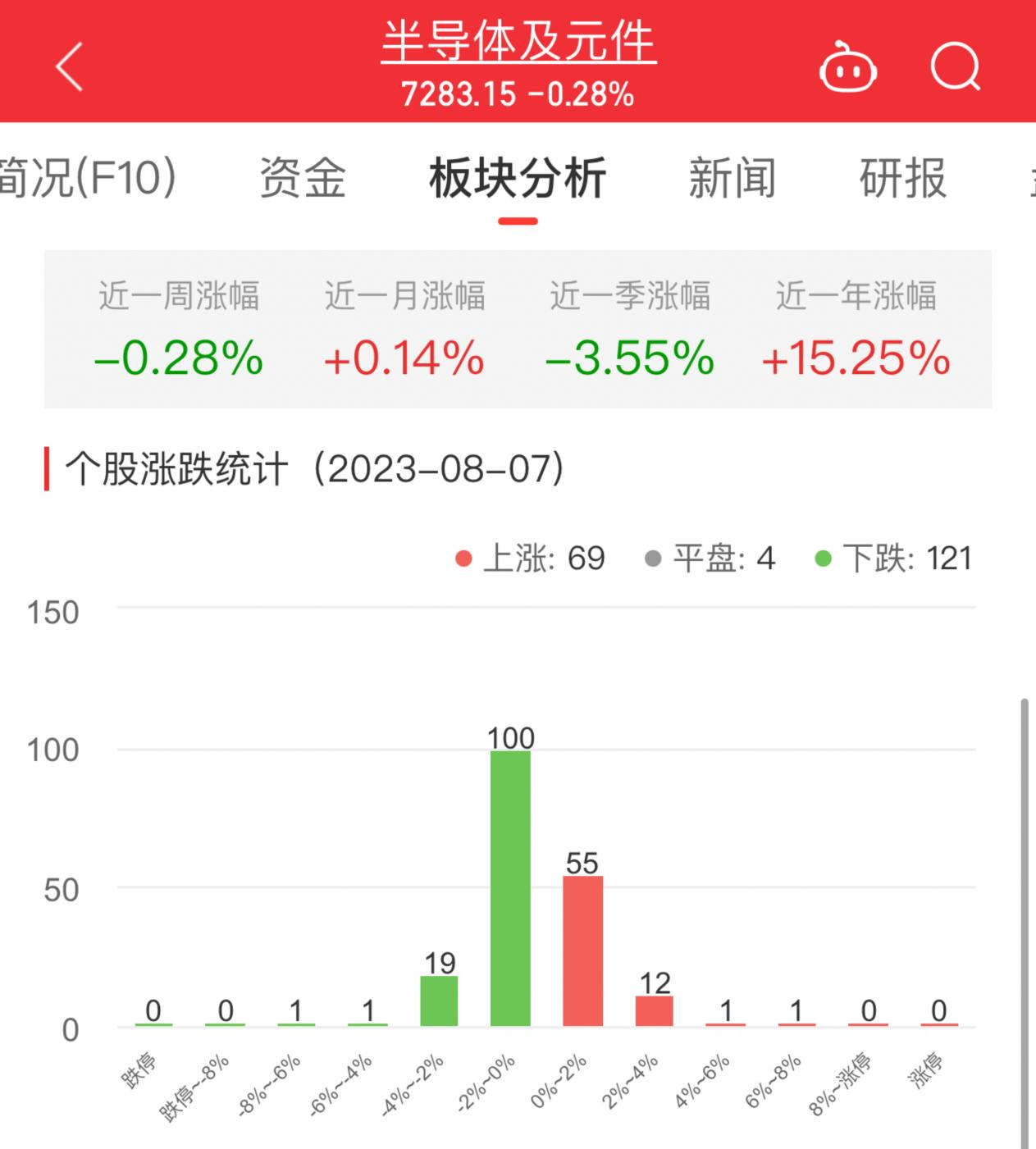 中国经济网北京8月7日讯 今日,半导体及元件板块整体跌幅0.28%,其中69只股票上涨,4只股票平盘,121只股票下跌。