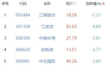 江海股份、江波龙、中微半导、安凯微、中芯国际位列涨幅榜后五位,涨幅分别为-7.33%、-4.89%、-3.81%、-3.77%、-3.60%。