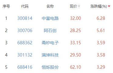其中,中富电路、阿石创、甬矽电子、满坤科技、恒烁股份位列板块涨幅前五位,涨幅分别为6.28%、5.61%、3.59%、3.58%、3.29%。
