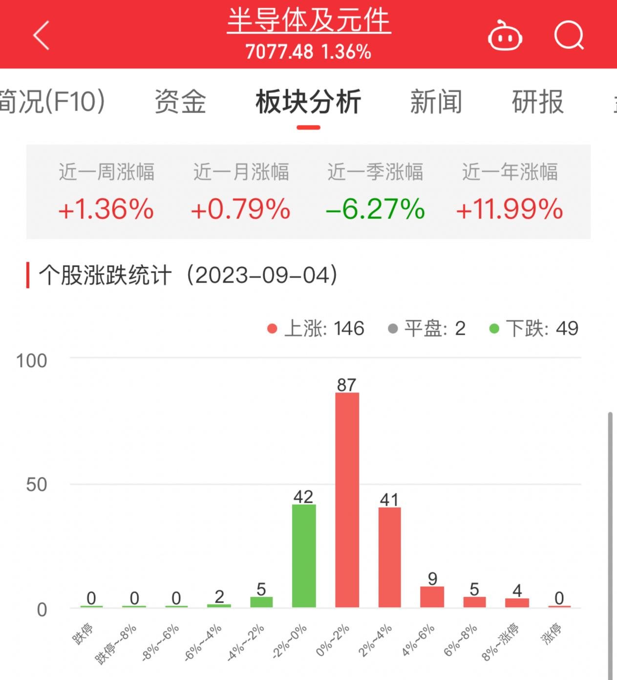 中国经济网北京9月4日讯 今日,半导体及元件板块整体涨幅1.36%,其中146只股票上涨,2只股票平盘,49只股票下跌。