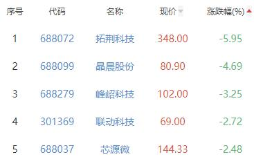 拓荆科技、晶晨股份、峰岹科技、联动科技、芯源微位列涨幅榜后五位,涨幅分别为-5.95%、-4.69%、-3.25%、-2.72%、-2.48%。