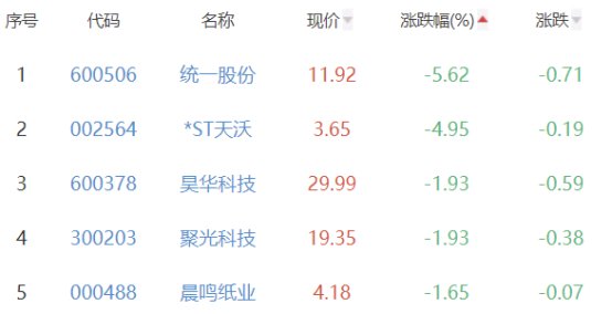 统一股份、*ST天沃、昊华科技、聚光科技、晨鸣纸业位列板块涨幅榜后五位,涨幅分别为-5.62%、-4.95%、-1.93%、-1.93%、-1.65%。