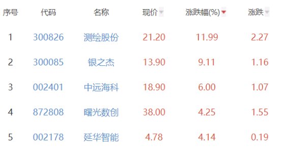 其中,测绘股份、银之杰、中远海科、曙光数创、延华智能位列板块涨幅榜前五位,涨幅分别为11.99%、9.11%、6.00%、4.25%、4.14%。