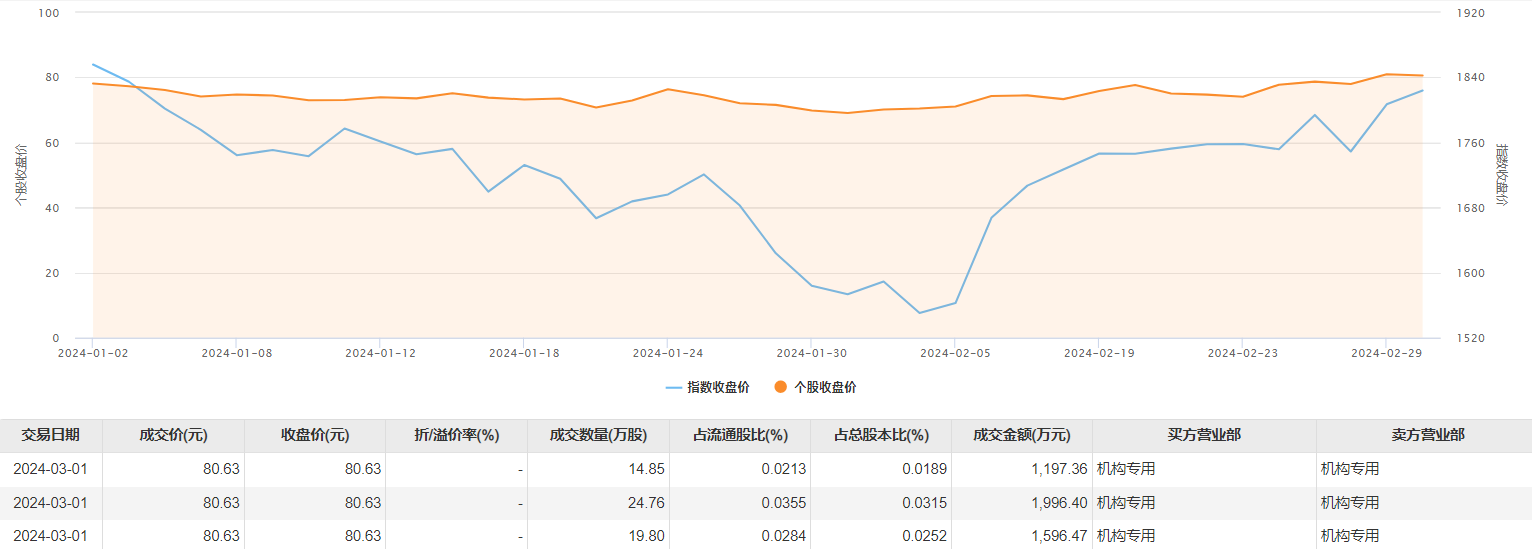 3月1日大宗交易成交59.41万股,成交额4790.23万元,占当日总成交额的17.44%,成交价80.63元,较市场收盘价80.63元持平。