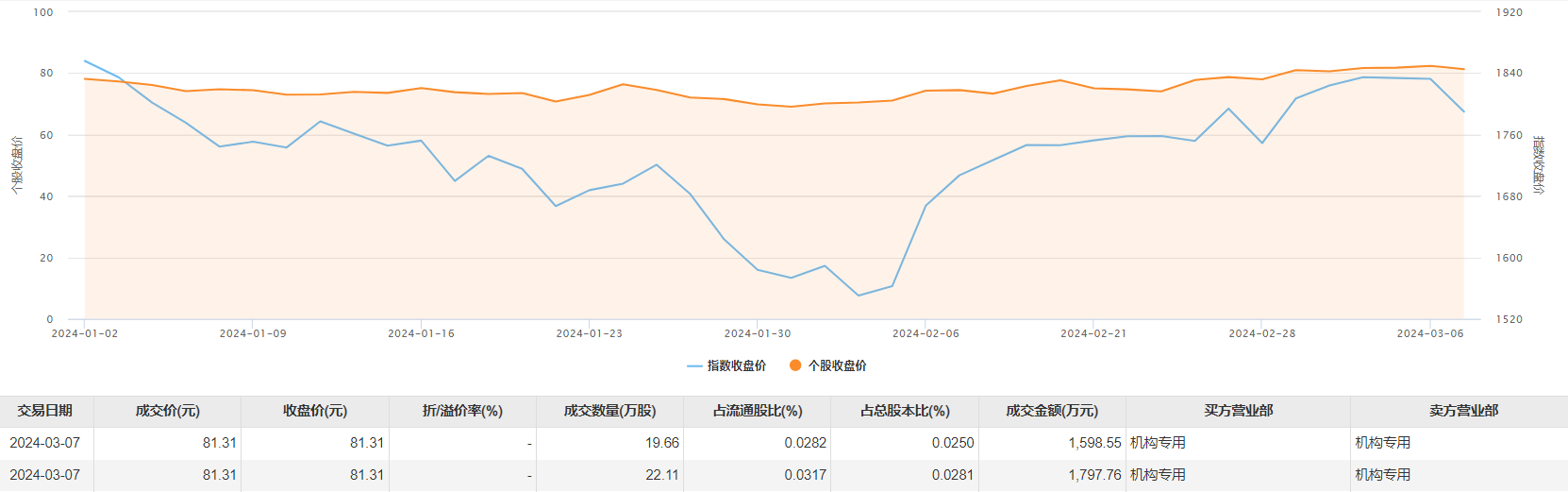 3月7日大宗交易成交41.77万股,成交额3396.31万元,占当日总成交额的23.6%,成交价81.31元,较市场收盘价81.31元持平。