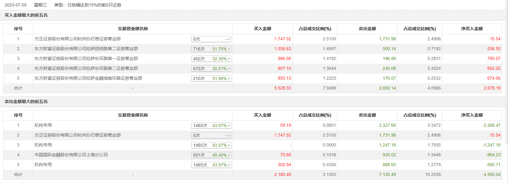 具体来看,机构买入362.13万元,卖出4463.49万元,合计净卖出4101.36万元。此外,方正证券杭州白石巷证券营业部、东方财富证券拉萨团结路第二证券营业部分别买入1747.52万元、1036.63万元;方正证券杭州白石巷证券营业部、中国国际金融上海分公司分别卖出1731.98万元、935.02万元。