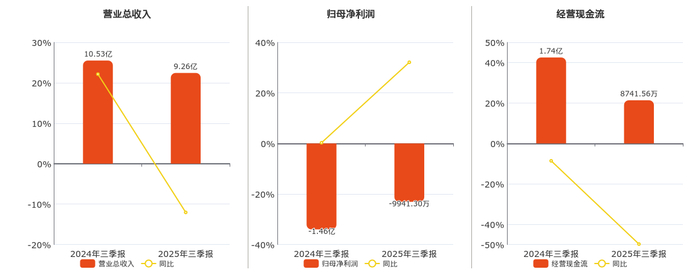 公司营业总收入为9.26亿元,较去年同报告期营业总收入减少1.27亿元,同比较去年同期下降12.05%。归母净利润为-9941.30万元。经营活动现金净流入为8741.56万元,较去年同报告期经营活动现金净流入减少8662.22万元,同比较去年同期下降49.77%。