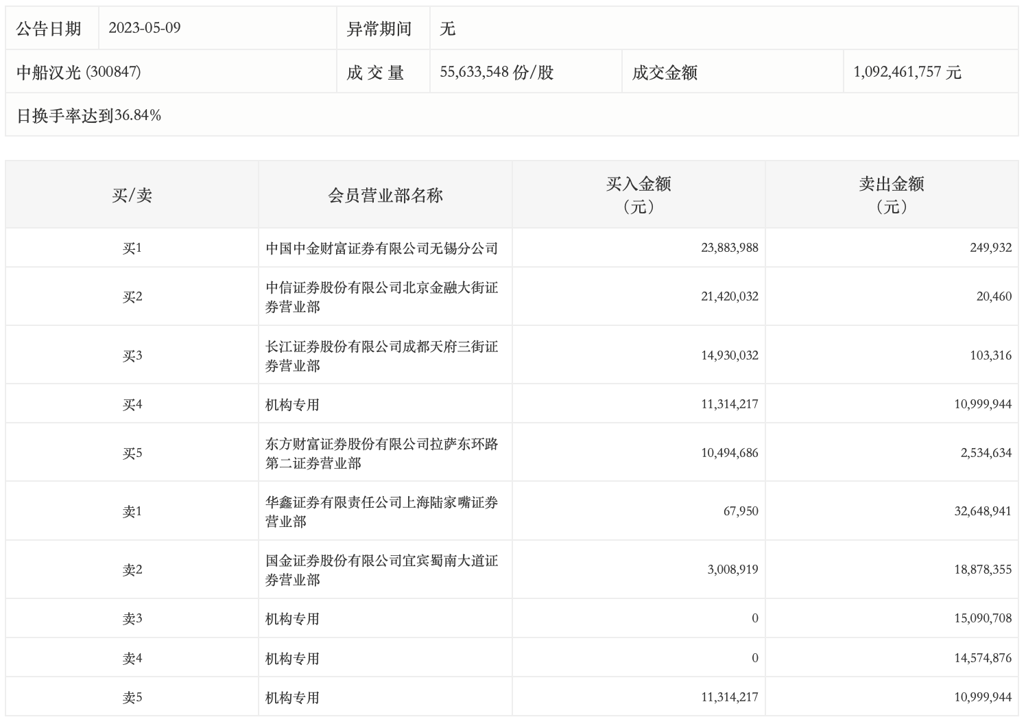 5月9日,中船汉光今日涨19.17%,龙虎榜数据显示,上榜营业部席位全天成交1.8亿元,占当日总成交金额比例为16.5%。其中,买入金额为8511.98万元,卖出金额为9510.12万元,合计净卖出998.13万元。