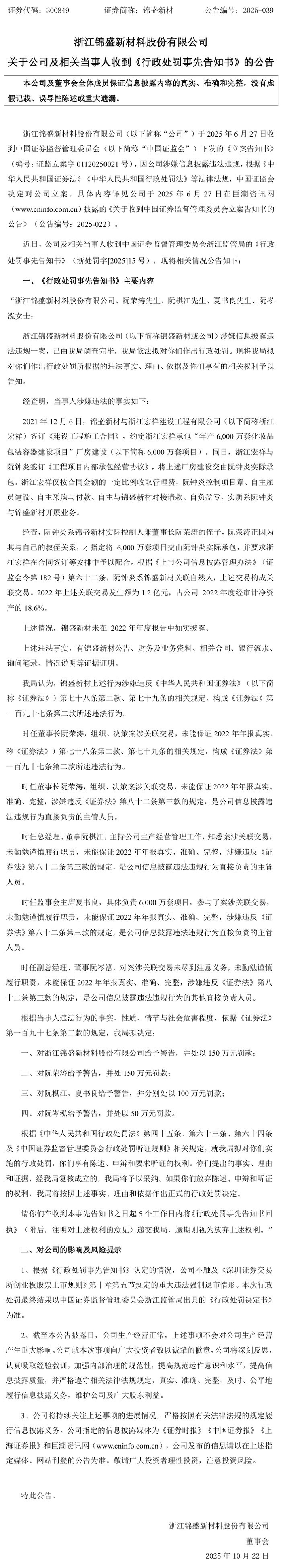近日,锦盛新材(300849.SZ)公告称,公司及相关当事人收到浙江证监局的《行政处罚事先告知书》,拟对公司给予警告,并处以150万元罚款;拟对相关当事人给予警告,并处罚款,相关人员罚款合计400万元。