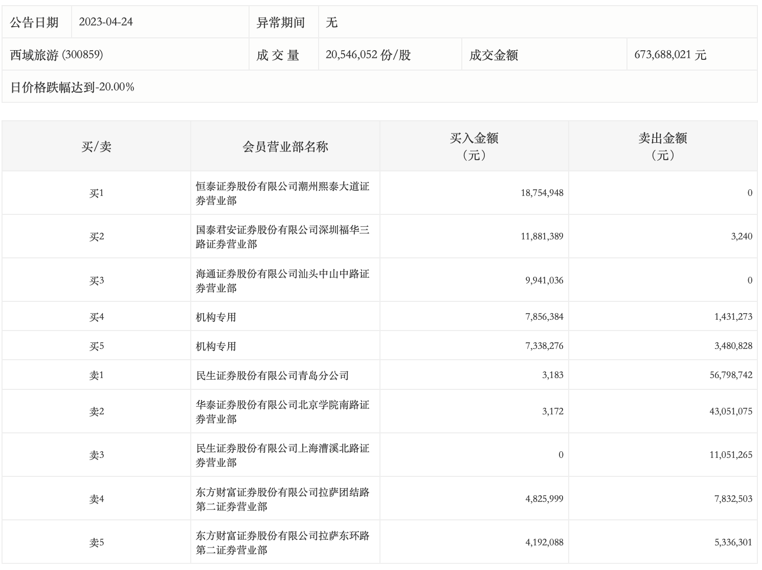 4月24日,西域旅游今日跌停,龙虎榜数据显示,上榜营业部席位全天成交1.94亿元,占当日总成交金额比例为28.76%。其中,买入金额为6479.65万元,卖出金额为1.29亿元,合计净卖出6418.88万元。