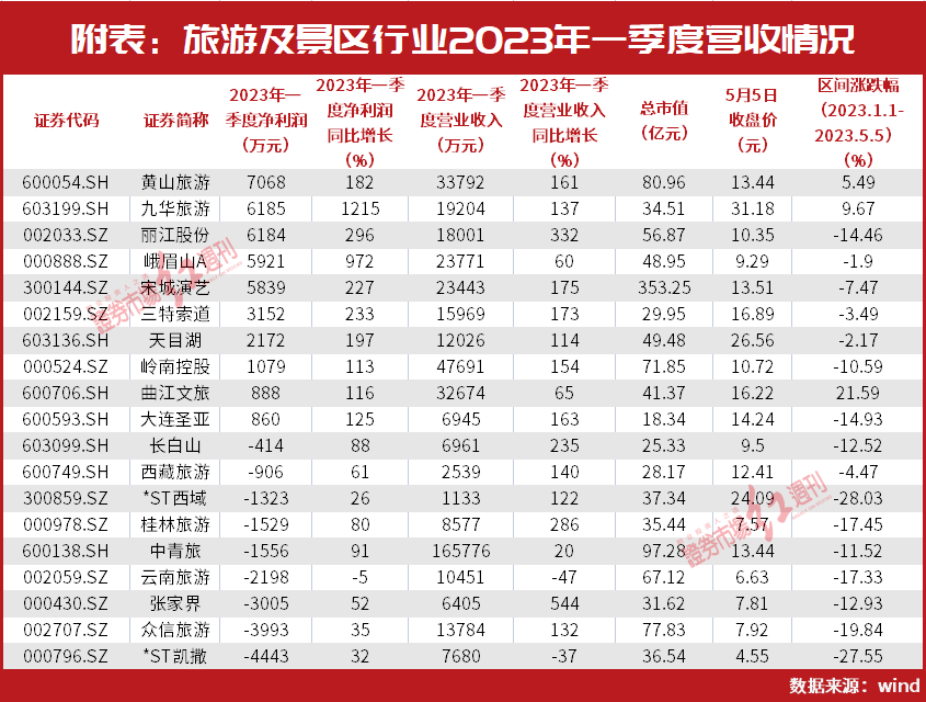 《红周刊》查询Wind数据统计,今年一季度,19家A股旅游及景区上市企业(万得申万分类)营业收入合计45.68亿元,较去年同期增长60.77%;净利润规模合计2亿元,同比增幅超过100%。