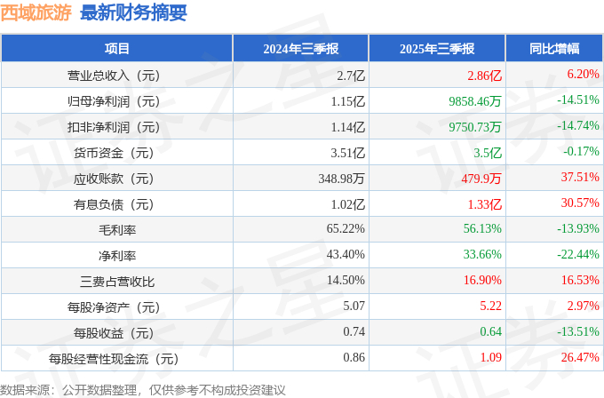 据证券之星公开数据整理,近期西域旅游(300859)发布2025年三季报。根据财报显示,西域旅游增收不增利。截至本报告期末,公司营业总收入2.86亿元,同比上升6.2%,归母净利润9858.46万元,同比下降14.51%。按单季度数据看,第三季度营业总收入1.73亿元,同比上升4.07%,第三季度归母净利润8735.81万元,同比上升1.65%。