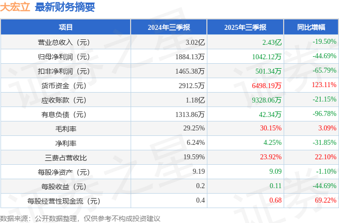 据证券之星公开数据整理,近期大宏立(300865)发布2025年三季报。根据财报显示,大宏立净利润同比下降44.69%。截至本报告期末,公司营业总收入2.43亿元,同比下降19.5%,归母净利润1042.12万元,同比下降44.69%。按单季度数据看,第三季度营业总收入6281.92万元,同比下降40.69%,第三季度归母净利润140.2万元,同比下降82.07%。