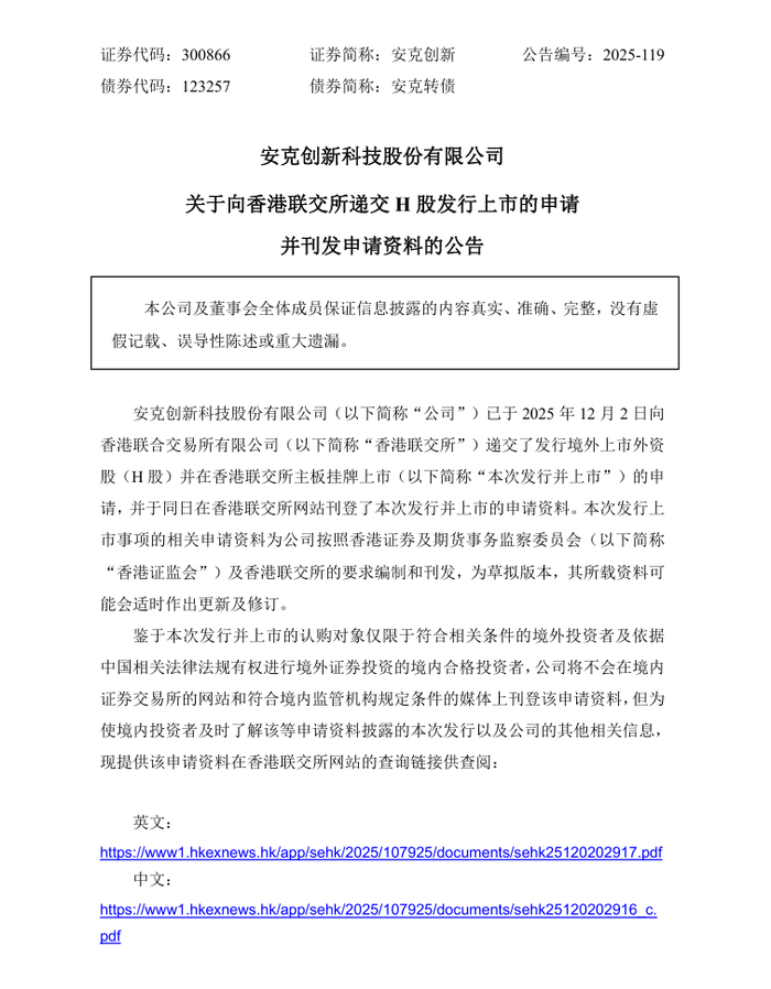 IT之家 12 月 5 日消息,安克创新 12 月 3 日发布公告,已于 2025 年 12 月 2 日向香港联合交易所有限公司递交了发行境外上市外资股(H 股)并在香港联交所主板挂牌上市的申请,并于同日在香港联交所网站刊登了本次发行并上市的申请资料。
