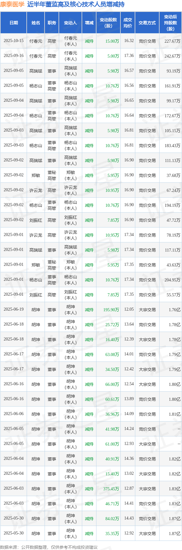康泰医学近半年内的董监高及核心技术人员增减持详情如下: