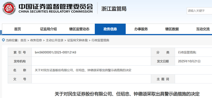 瑞财经 王敏10月21日,浙江证监局发布关于对民生证券股份有限公司(以下简称“民生证券”)任绍忠、钟德颂采取出具警示函措施的决定。