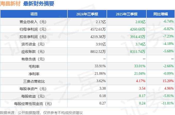 海昌新材(300885)2025年三季报简析:净利润同比下降6.82%,公司应收账款体量较大