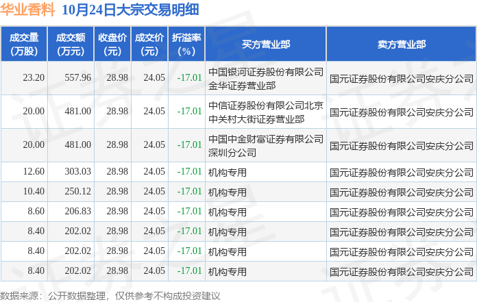 10月24日华业香料现9笔折价17.01%的大宗交易 合计成交2886万元