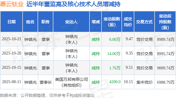 惠云钛业近半年内的董监高及核心技术人员增减持详情如下: