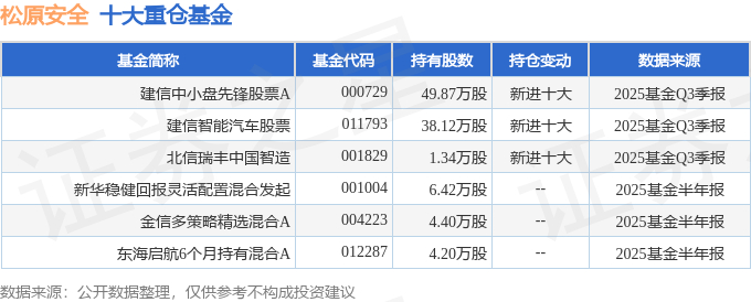 持有松原安全最多的基金为建信中小盘先锋股票A,目前规模为5.21亿元,最新净值3.664(10月24日),较上一交易日上涨0.36%,近一年上涨10.93%。该基金现任基金经理为张湘龙。