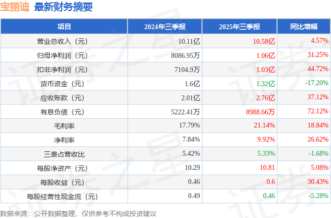据证券之星公开数据整理,近期宝丽迪(300905)发布2025年三季报。截至本报告期末,公司营业总收入10.58亿元,同比上升4.57%,归母净利润1.06亿元,同比上升31.25%。按单季度数据看,第三季度营业总收入3.82亿元,同比上升10.53%,第三季度归母净利润4232.3万元,同比上升66.17%。本报告期宝丽迪应收账款上升,应收账款同比增幅达37.12%。