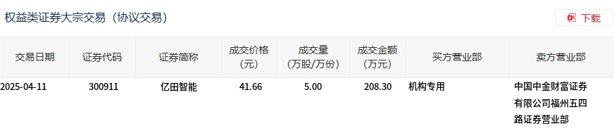 亿田智能今日大宗交易平价成交5万股,成交额208.3万元