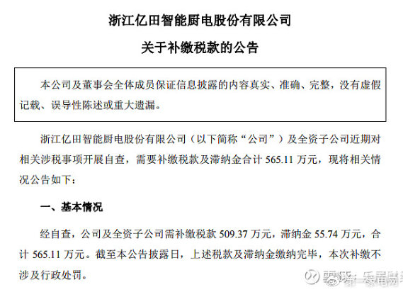 乐居财经 李兰 10月13日,亿田智能(300911.SZ)发布公告,经自查,公司及全资子公司需补缴税款509.37万元,滞纳金55.74万元,合计565.11万元。