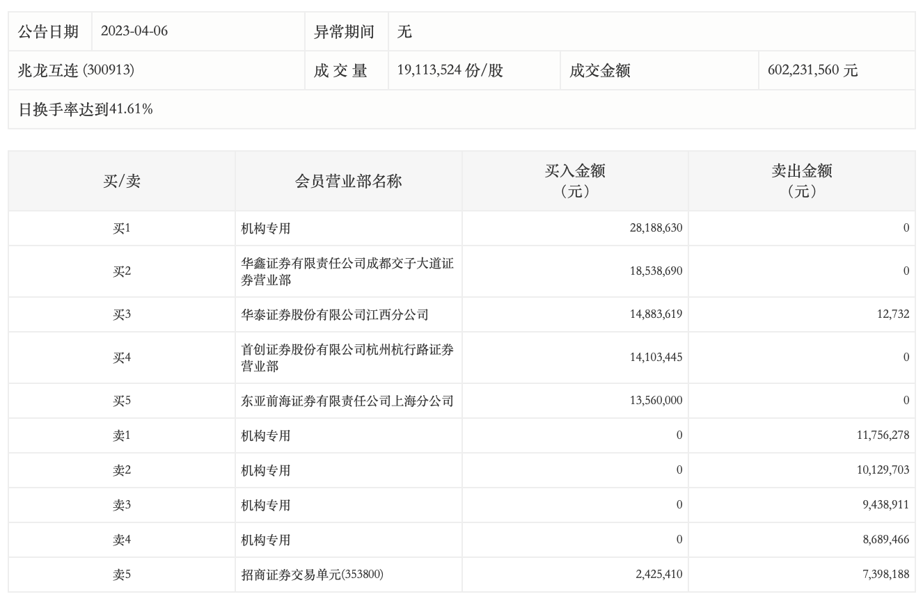 4月6日,兆龙互连今日涨停,龙虎榜数据显示,上榜营业部席位全天成交1.39亿元,占当日总成交金额比例为23.1%。其中,买入金额为9169.98万元,卖出金额为4742.53万元,合计净买入4427.45万元。