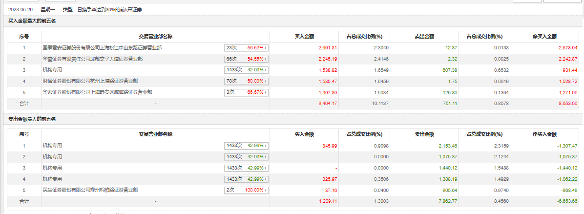具体来看,机构买入2710.77万元,卖出7564.51万元,合计净卖出4853.74万元。此外,国泰君安证券上海松江中山东路证券营业部、华鑫证券成都交子大道证券营业部分别买入2691.81万元、2245.19万元;民生证券郑州桐柏路证券营业部、华泰证券上海静安区威海路证券营业部分别卖出905.64万元、126.80万元。