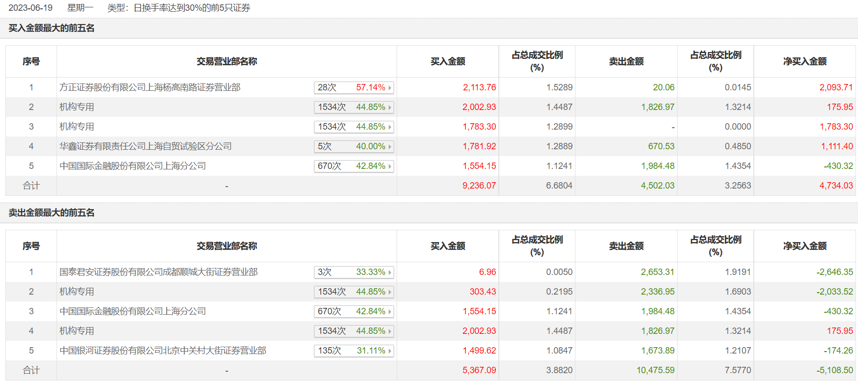 具体来看,机构买入4089.65万元,卖出4163.92万元,合计净卖出74.27万元。此外,方正证券上海杨高南路证券营业部、华鑫证券上海自贸试验区分公司分别买入2113.76万元、1781.92万元;国泰君安证券成都顺城大街证券营业部、中国国际金融上海分公司分别卖出2653.31万元、1984.48万元。