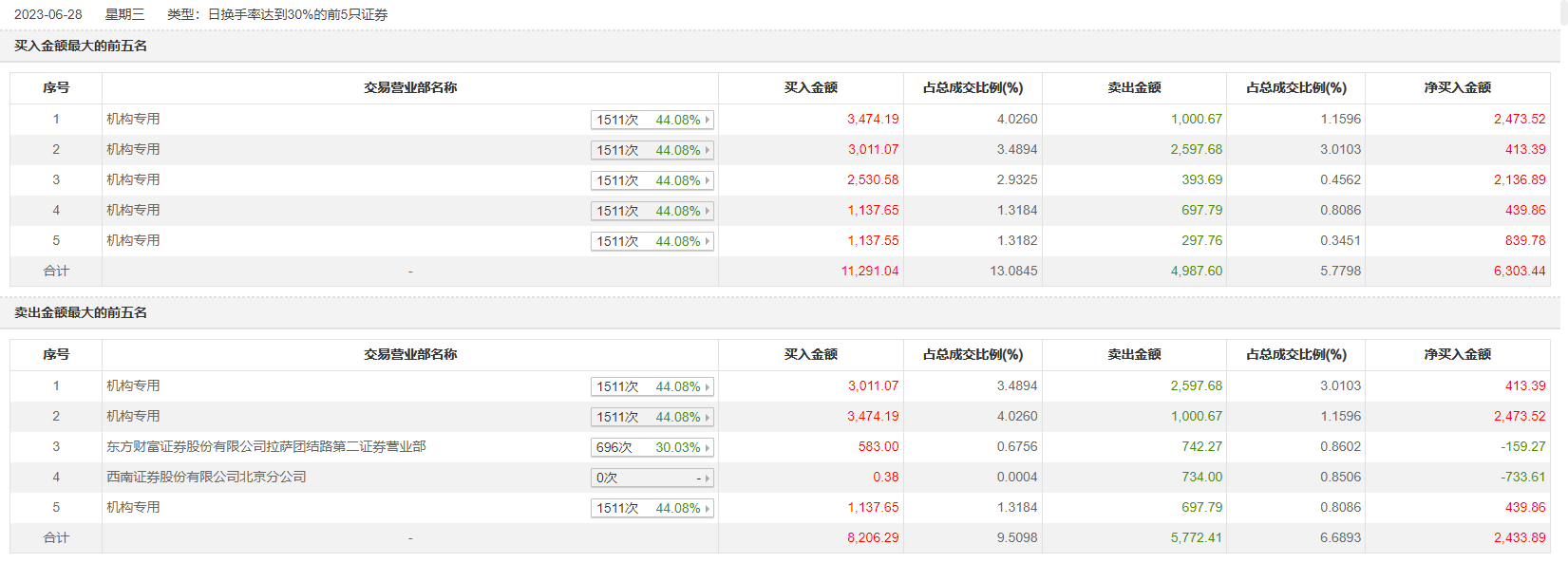 具体来看,机构买入1.13亿元,卖出4987.6万元,合计净买入6303.44万元。此外,东方财富证券拉萨团结路第二证券营业部、西南证券北京分公司分别卖出742.27万元、734.00万元;东方财富证券拉萨团结路第二证券营业部、西南证券北京分公司分别买入583.00万元、3849元。