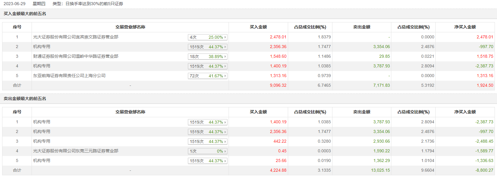 具体来看,机构买入4224.43万元,卖出1.14亿元,合计净卖出7210.5万元。此外,光大证券宜宾崇文路证券营业部、财通证券温岭中华路证券营业部分别买入2478.01万元、1548.60万元;光大证券东莞三元路证券营业部、财通证券温岭中华路证券营业部分别卖出1590.22万元、29.85万元。