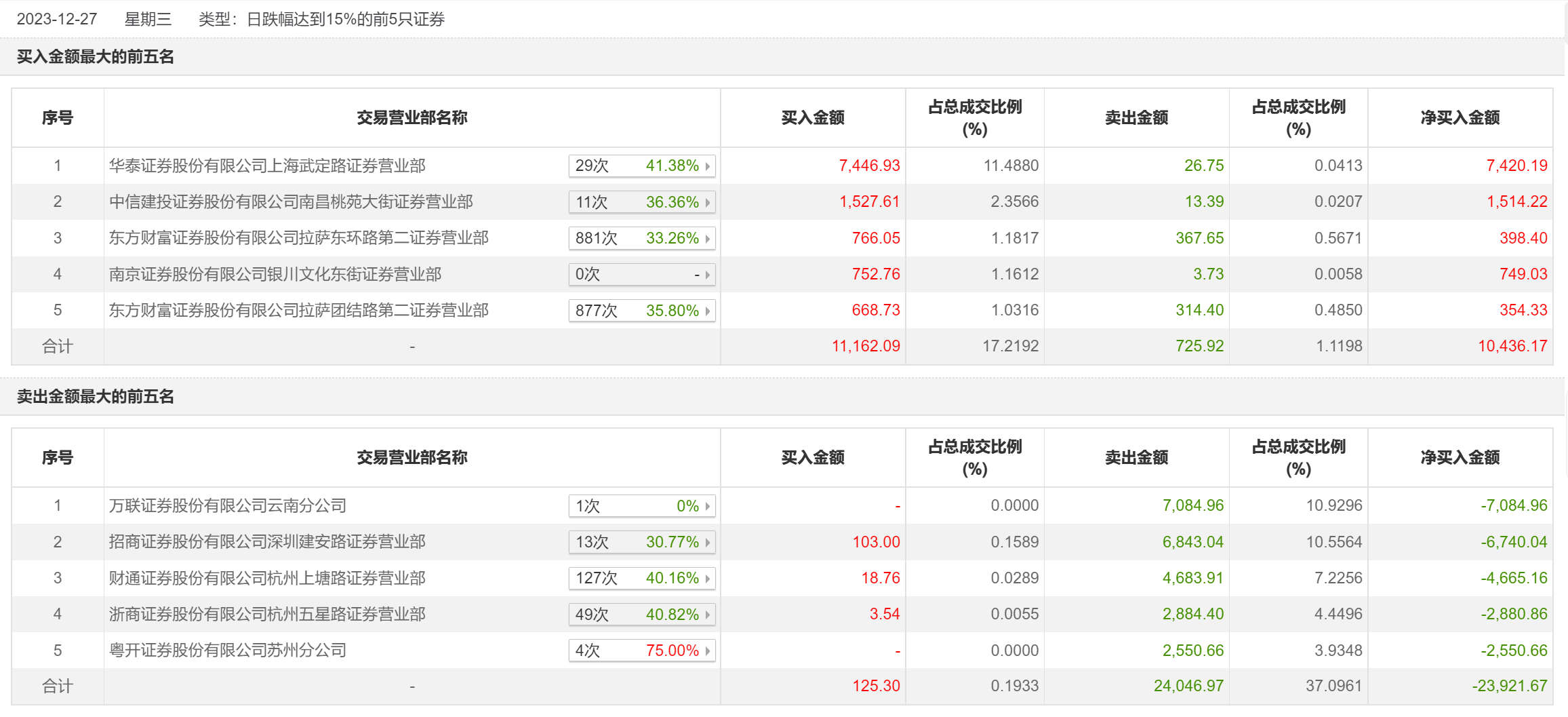 12月27日,奥雅股份今日跌19.18%,全天换手率达58.83%,振幅达18.72%。龙虎榜数据显示,营业部席位合计净卖出1.35亿元。其中,万联证券云南分公司、招商证券深圳建安路证券营业部分别卖出7084.96万元、6843.04万元;华泰证券上海武定路证券营业部、中信建投证券南昌桃苑大街证券营业部分别买入7446.93万元、1527.61万元。