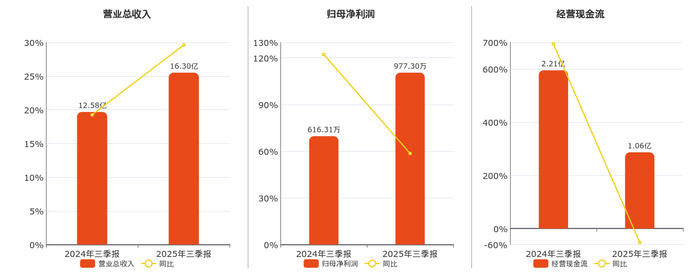公司营业总收入为16.30亿元。归母净利润为977.30万元。经营活动现金净流入为1.06亿元,较去年同报告期经营活动现金净流入减少1.14亿元,同比较去年同期下降51.83%。
